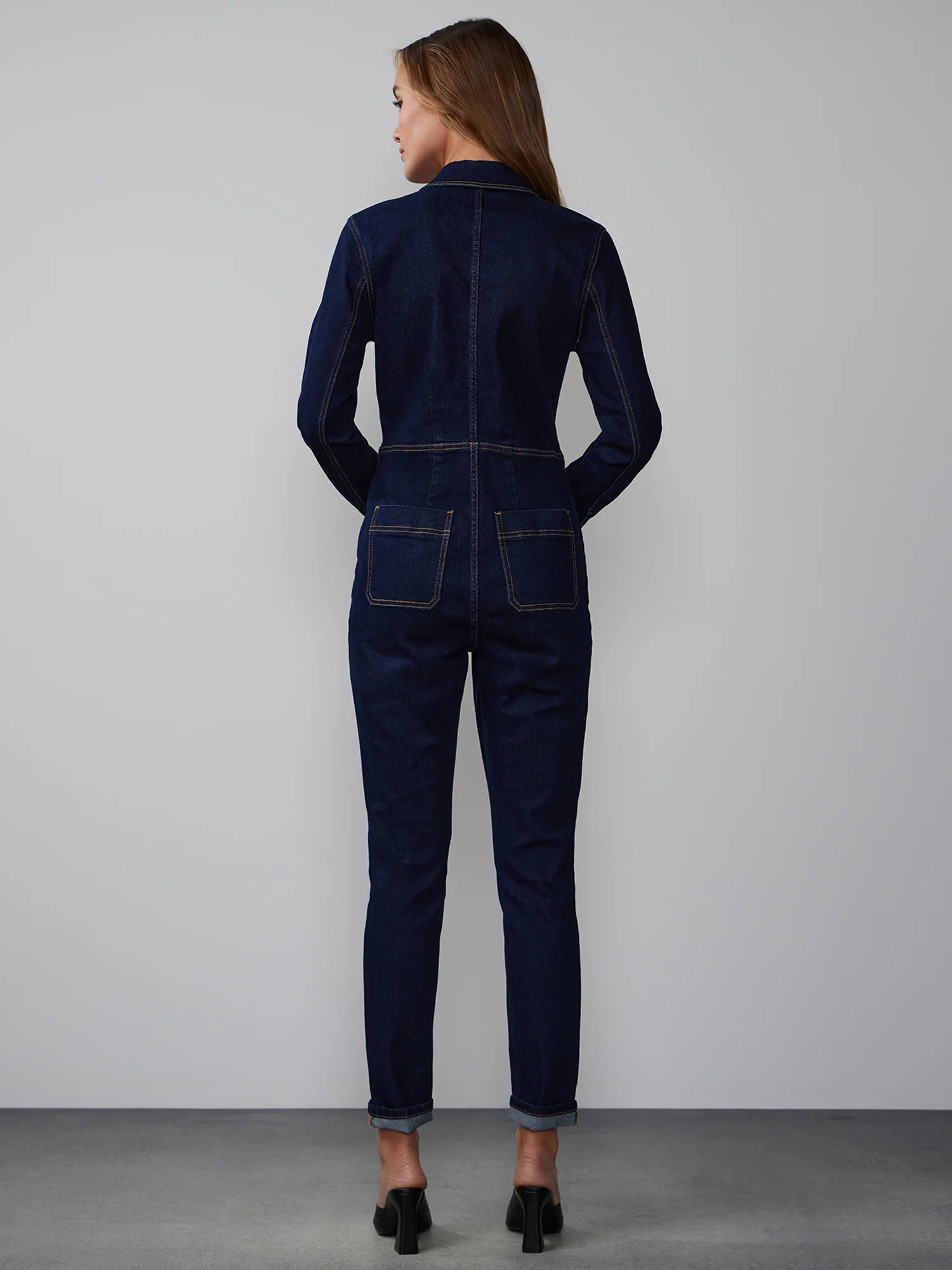 Effortlessly blend style and comfort with this chic jumpsuit. This versatile piece is designed for both fashion and functionality, featuring long sleeves, a convenient zipper front, a classic collared neckline, and strategically placed front and back pockets for added convenience.