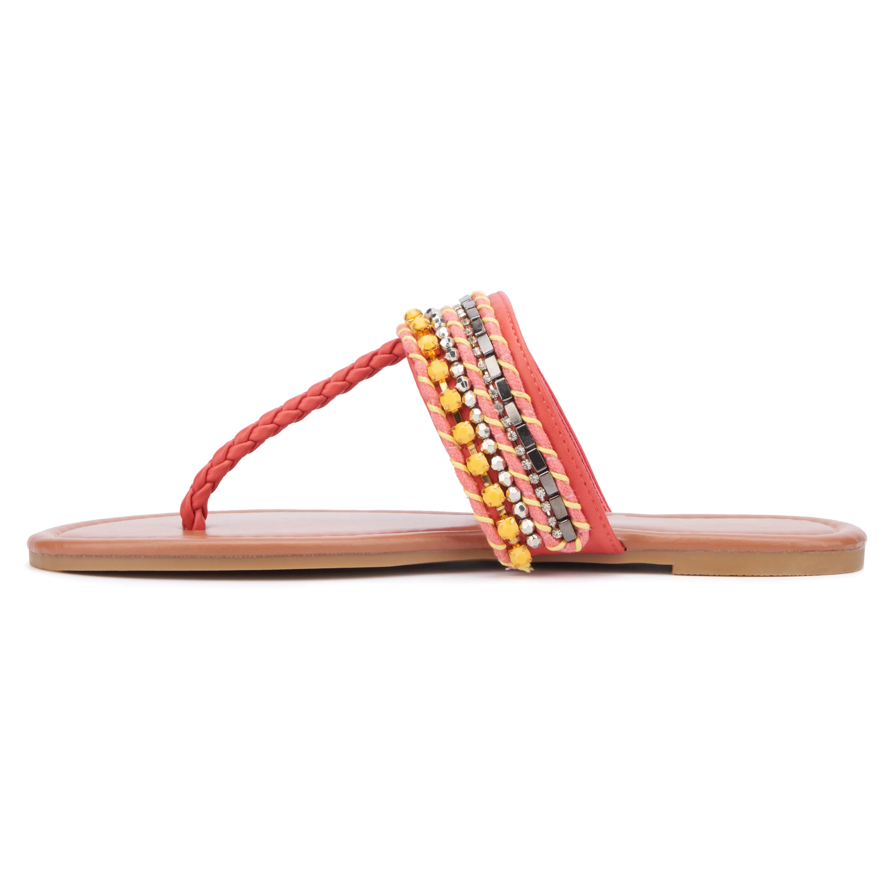 Get ready to turn heads in these shimmering showstoppers. With the perfect blend of pretty and playful, the Joyce thong beaded sandal features bohemian flare thanks to the lux rhinestones, braided t-strap, embellished cuff detail, and easy slip-on structure. Illuminate your look with this perfect blend of classic and contemporary, ideal for women who love to stay upbeat but chic.