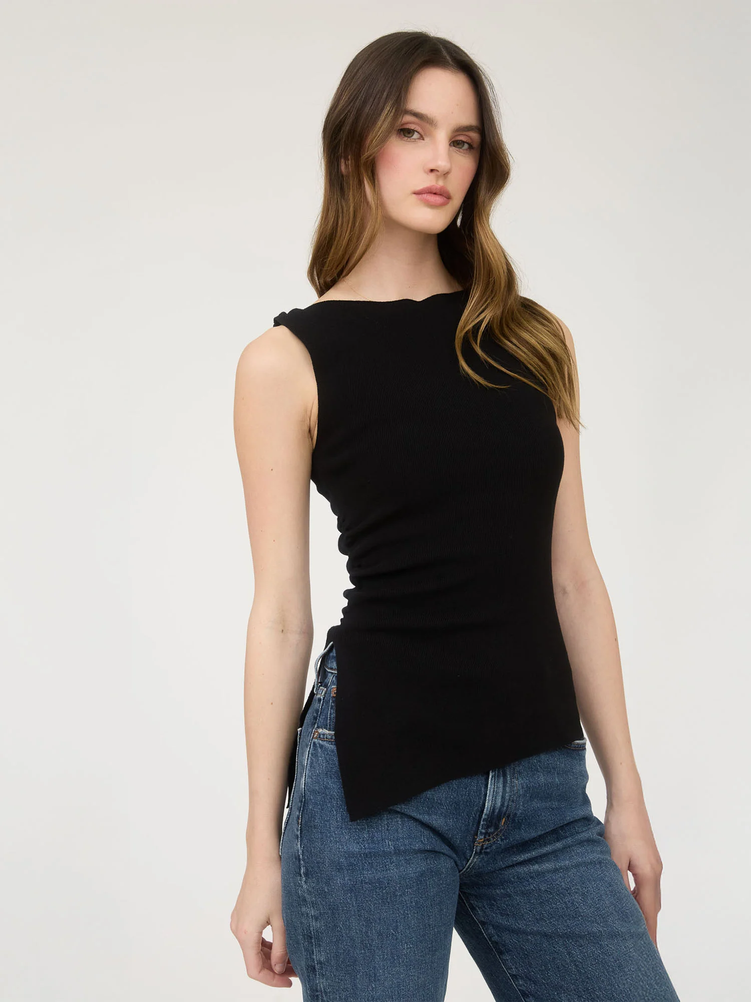 The Boat Neck Sleeveless Angle Knit Top offers modern minimalism with an architectural edge. Featuring a clean boat neckline and angled hem, this knit top is perfect for pairing with high-waisted trousers or skirts for a sleek, refined look.