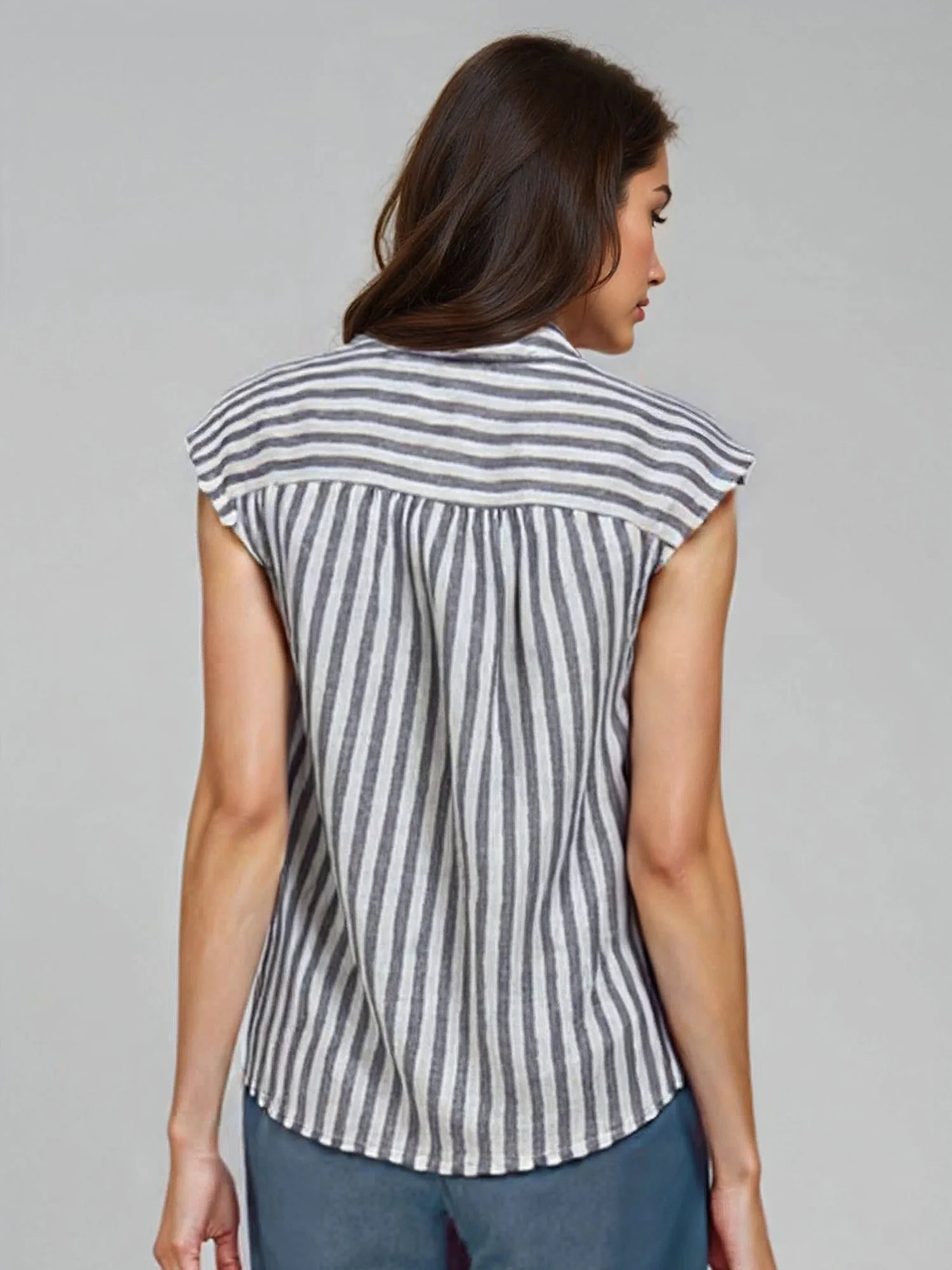 Light as air and effortlessly crisp, the Cap Sleeve Stripe Button Down Shirt brings a fresh feel to everyday outfits. With a classic stripe pattern and easy cap sleeves, it’s perfect for pairing with tailored pants or denim for laid-back sophistication.