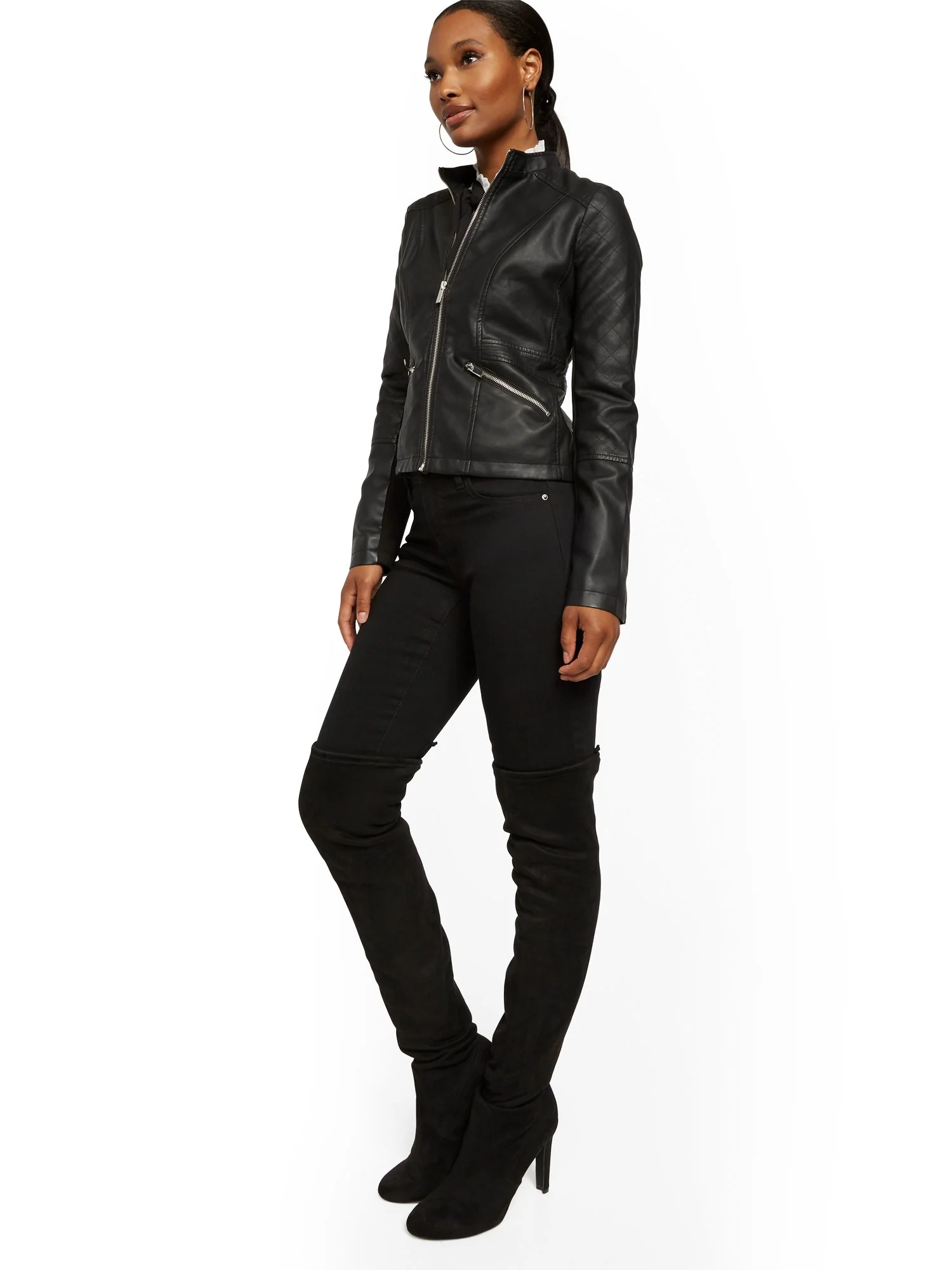 Look luxe: quilting elevates our faux-leather jacket, finished with an array of zip accents.