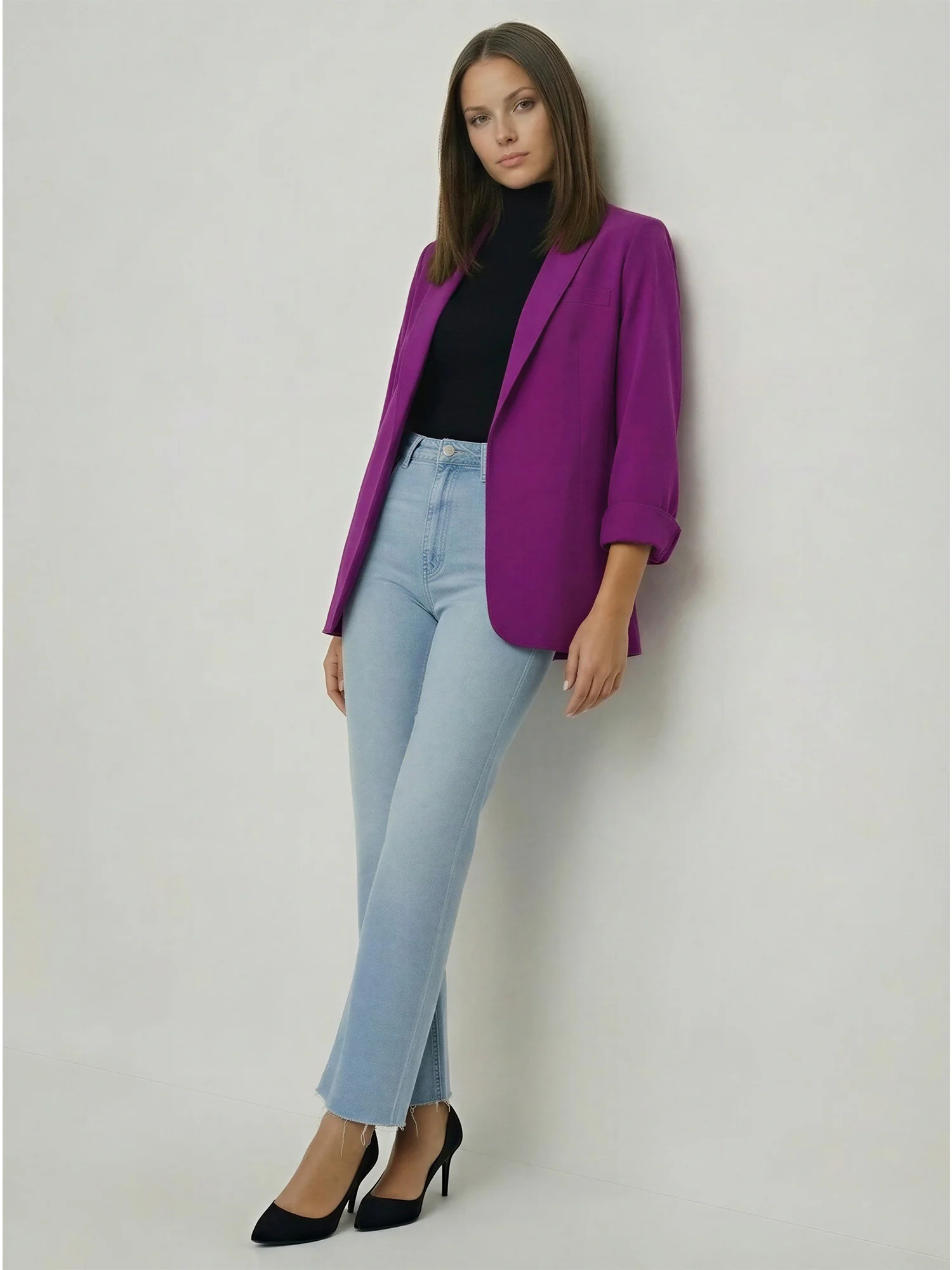 The Solid Vertigo Blazer features a clean, tailored silhouette perfect for work or evening wear. Its structured design and solid color make it a versatile wardrobe staple for polished looks.