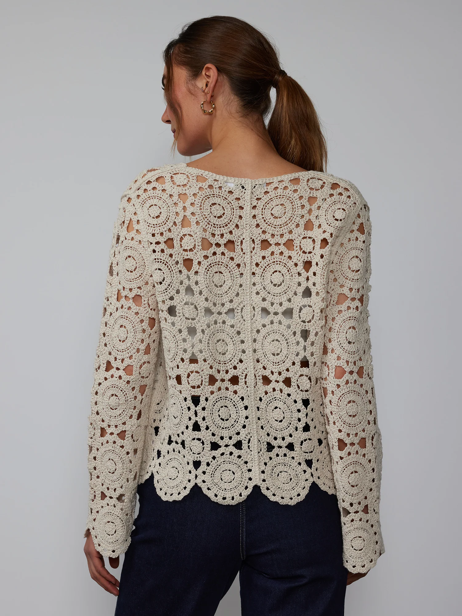 This sexy cardigan features a beautiful crochet knit all over and a scallop hem. It has a sexy v-neck along with polished long sleeves. With a button-front closure on the front, this cardigan is cute as well as stylish.