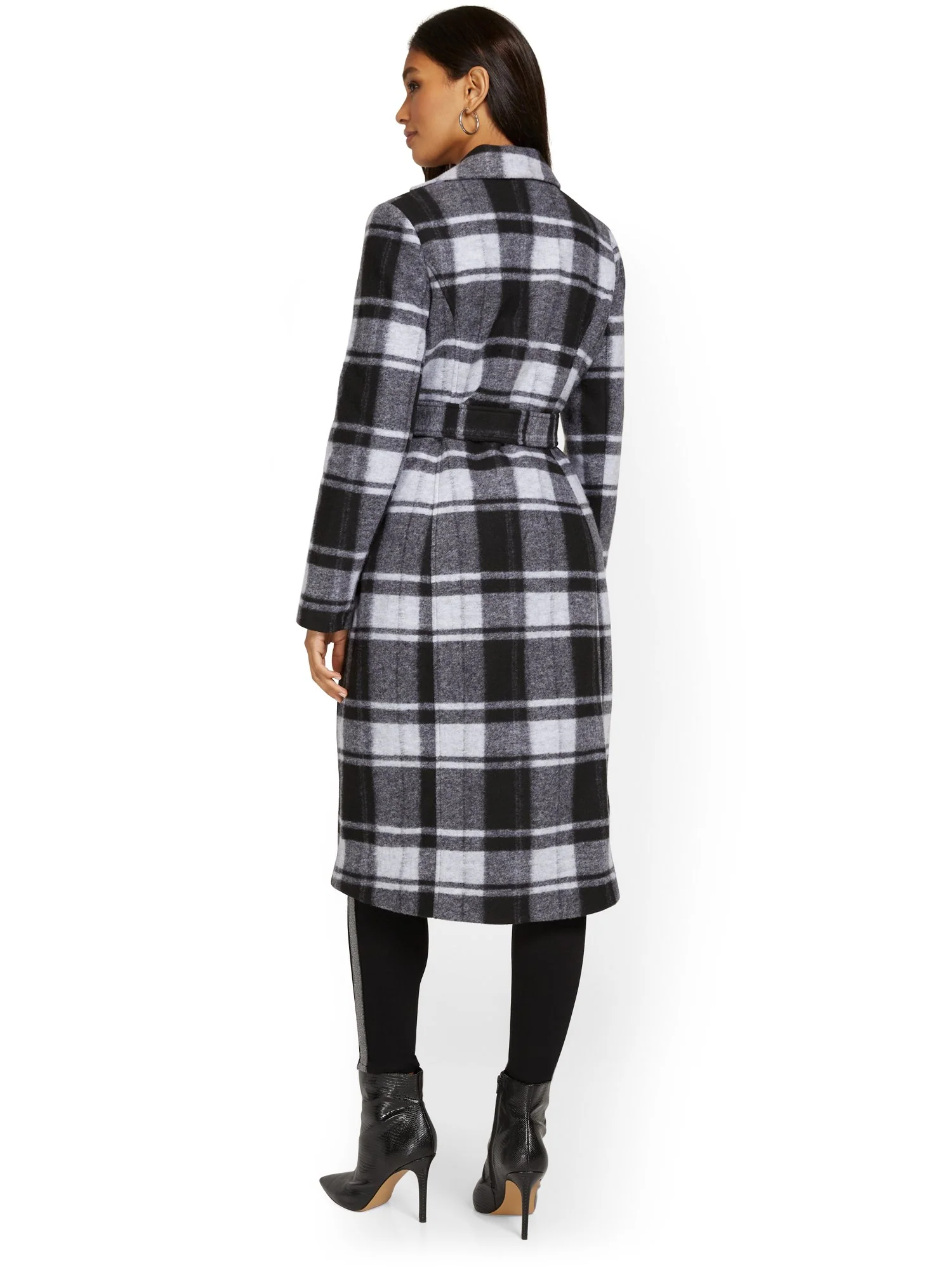 A comfy outerwear essential, this longline jacket is rendered in with a trendy plaid design. It features a belted waist for a flattering silhouette.
