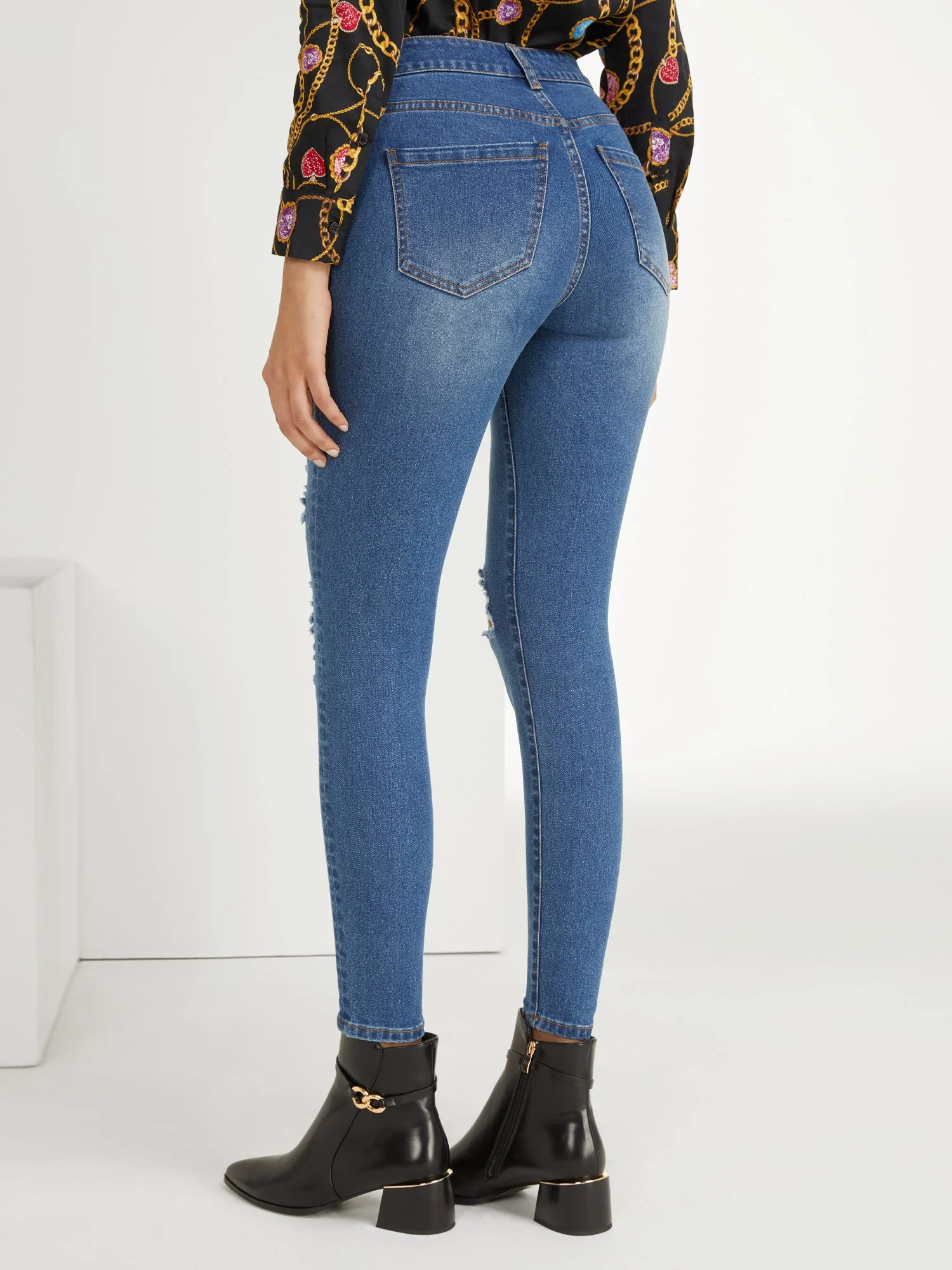 The classic skinny jeans get a glimmering update in this pair, designed with gold-tone sequins inset under distressed detailing at the knees and thighs.