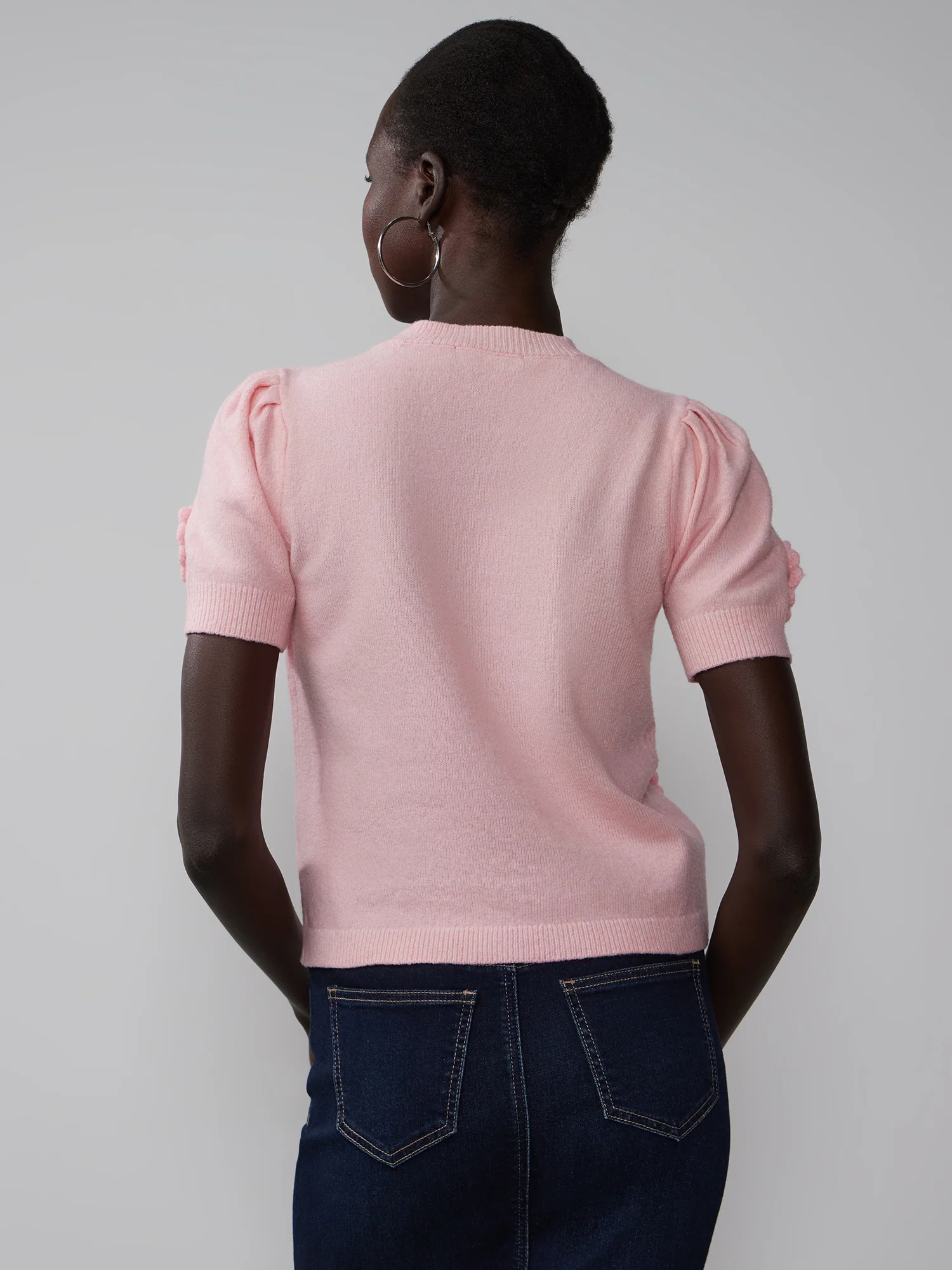 Stay warm in style with this sweater tee. Featuring chic short puff sleeves, a crew neckline, and a beautiful floral applique detail, this statement piece is sure to keep you cozy and looking great. The ribbed hem adds the perfect finishing touch.